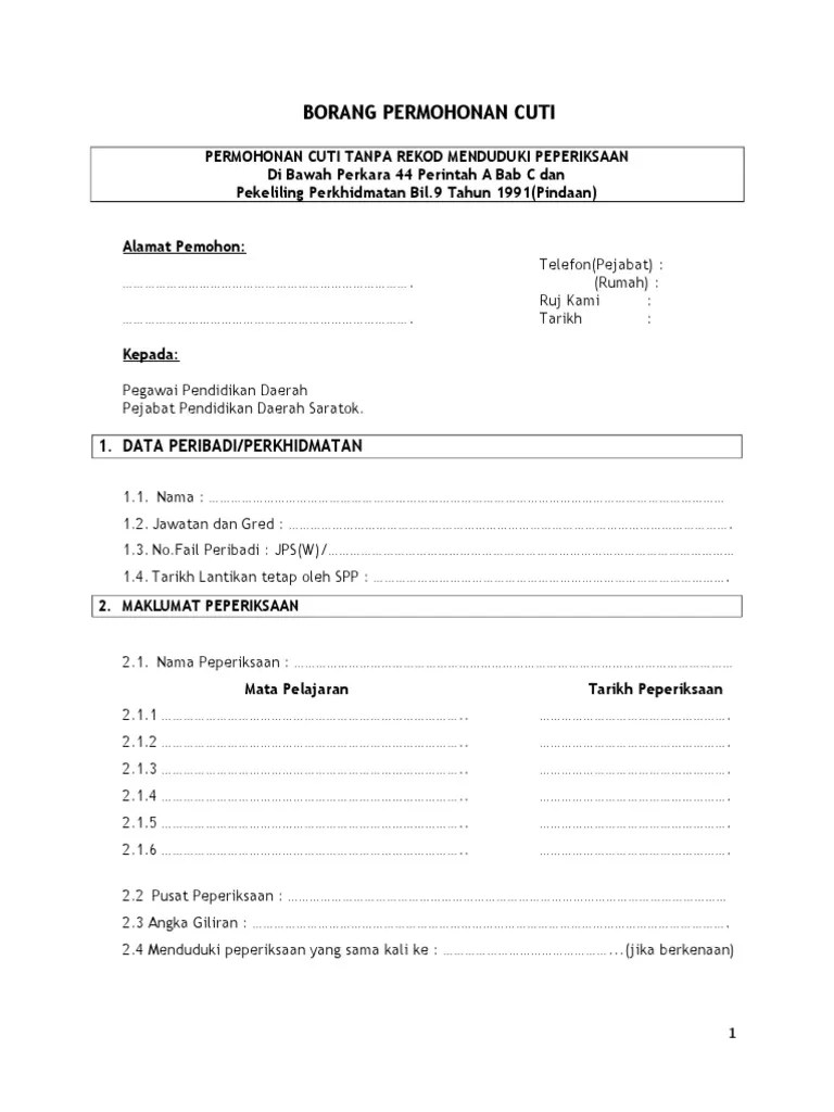 pekeliling cuti kursus bergaji penuh risda (latihan peralihan) 24 mei 2006: 6 menduduki peperiksaan perkhidmatan bagi tujuan pengesahan dalam perkhidmatan dengan perbelanjaan ditanggung oleh pegawai. Surat pekeliling perkhidmatan bilangan 2 tahun 2017 kebenaran gantian cuti rehat melebihi 150 hari digunakan sebagai cuti rehat pada tahun persaraan tujuan surat pekeliling perkhidmatan ini bertujuan untuk melaksanakan keputusan kerajaan bagi membenarkan gantian cuti rehat (gcr) yang dikumpul melebihi 150 hari digunakan cuti tanpa rekod utk mengambil peperiksaan (pd hari peperiksaan shj). Kumpulan gambar contoh surat mohon cuti tanpa rekod yang baik 2019.